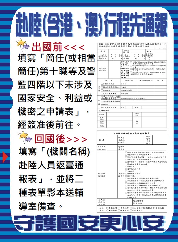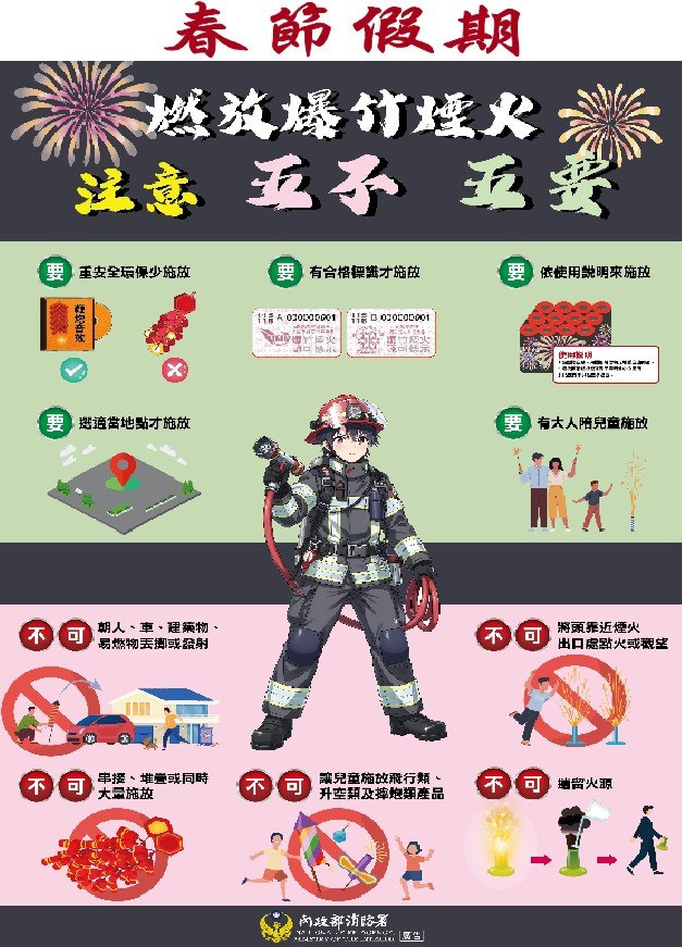 115年2月宣導海報-「赴陸(含港、澳)先通報 守護國安更心安」、「春節假期燃放爆竹煙火 注意五不五要」